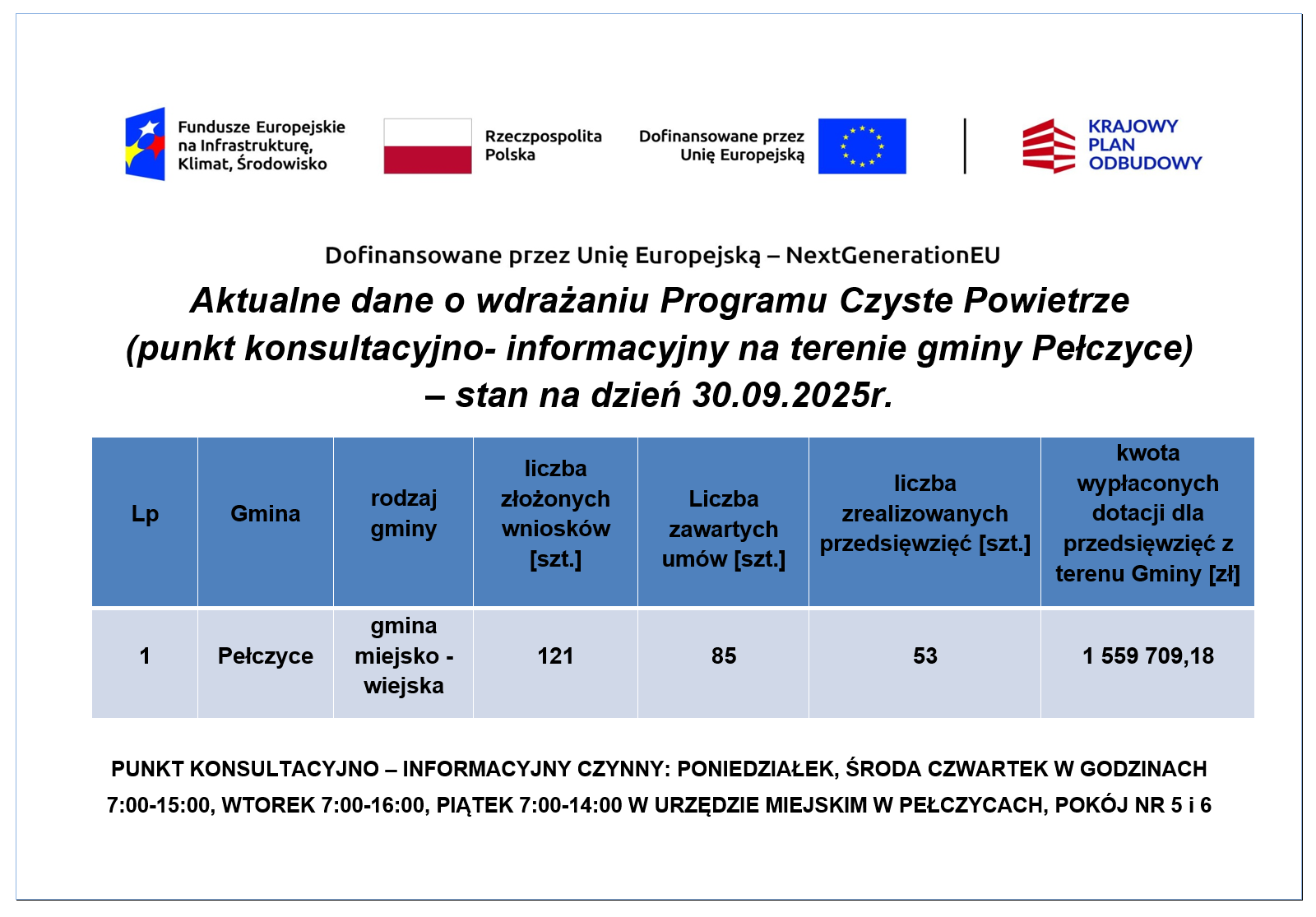 W ramach programu priorytetowego „Ciepłe Mieszkanie” Gmina Pełczyce podpisała umowę dofinansowania ww. zadania z WFOŚiGW w Szczecinie. Kwota do rozdysponowania w roku 2025 wynosi: 165 000,00 zł Początkowo w tej kwocie zawarto 6 umów na poziomie podwyższonym, ze względu na wpłynięcie wniosków kwalifikujących się na poziom najwyższy oraz podstawowy środki zostały przeniesione.